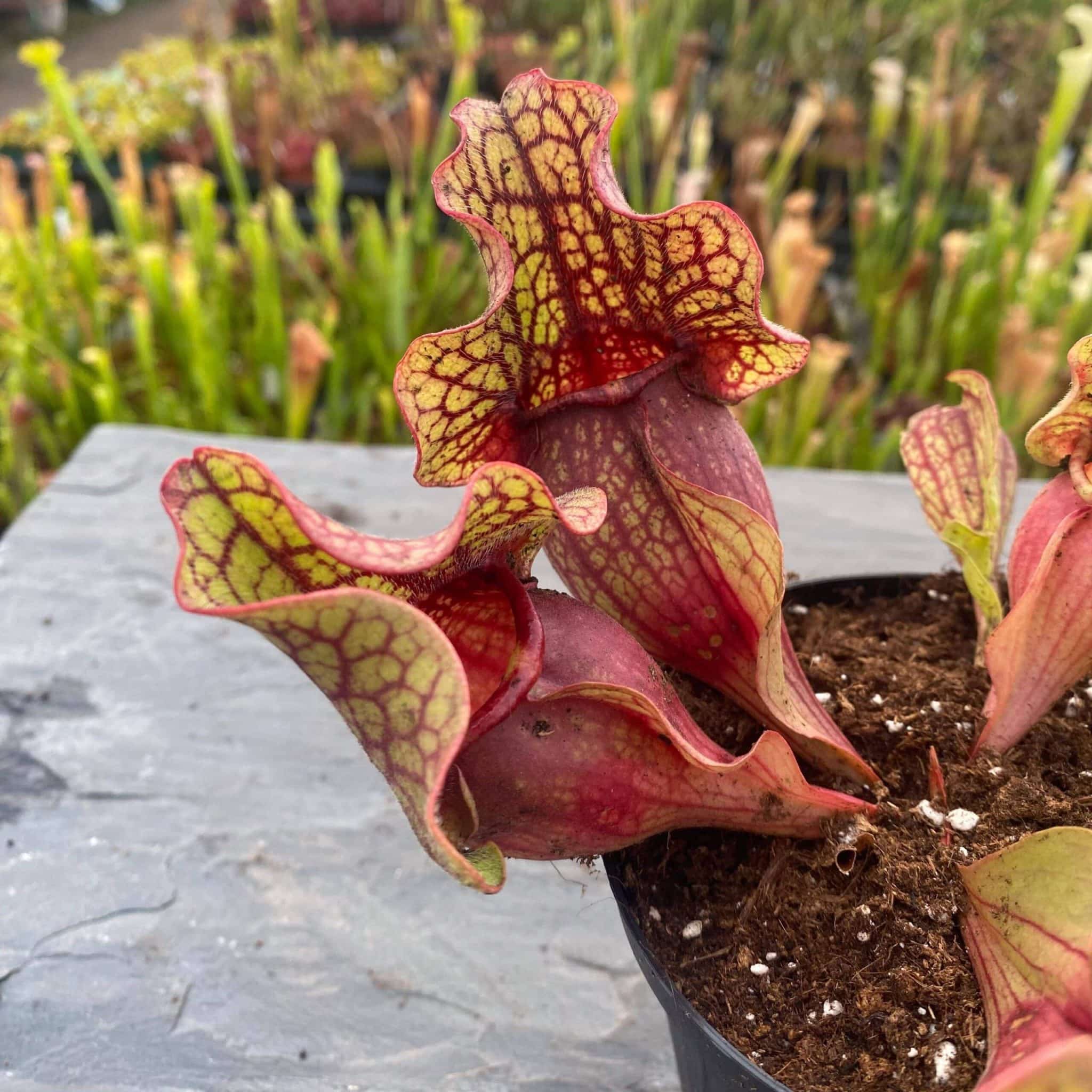 Sarracenia purpurea ssp. venosa var. burkei f. luteola x burkei „Veinless“